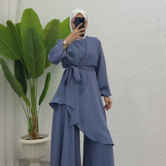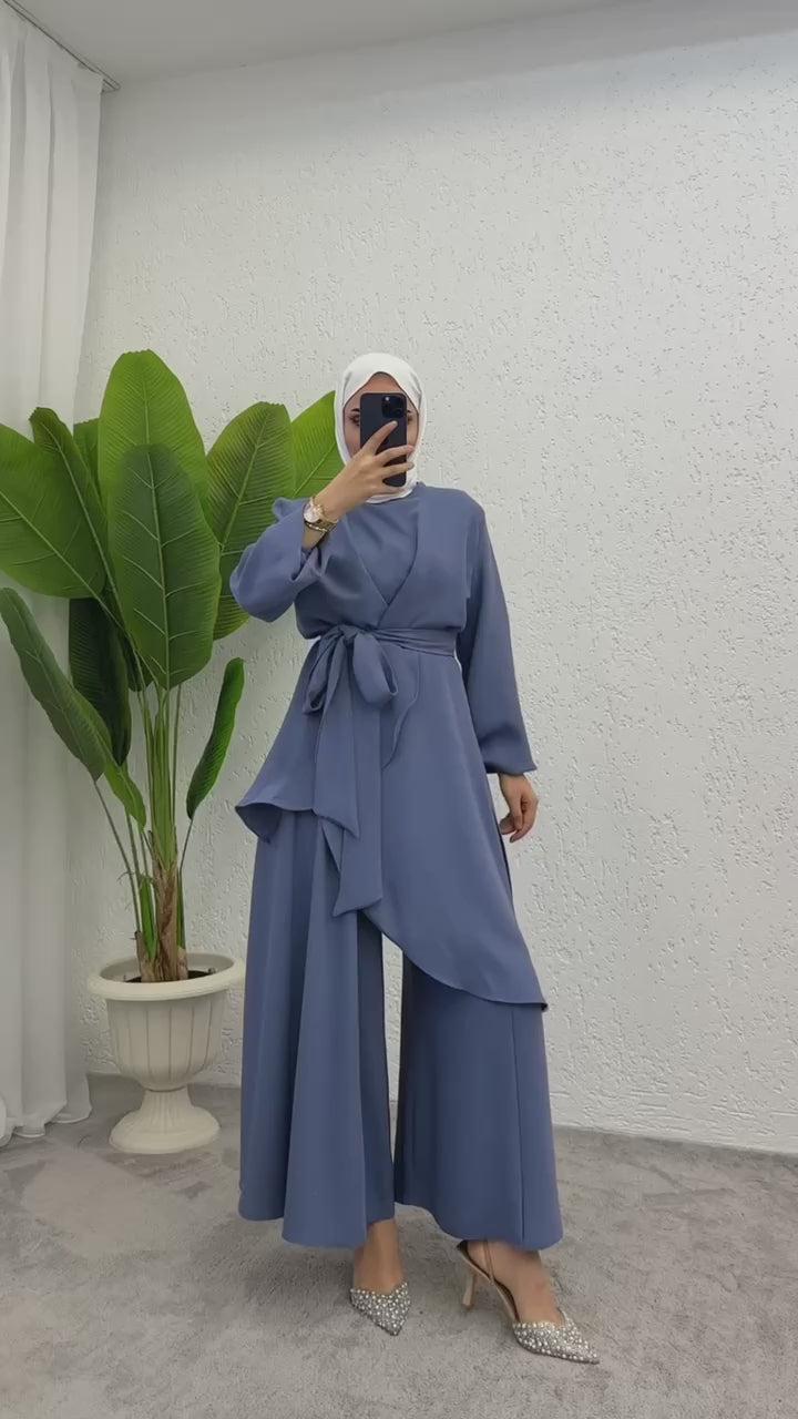 Discover the perfect combination of style and comfort with our PLEATED WIDE TROUSERS CO-ORD SET in STONE color. These luxurious hijab culottes pants have the appearance of a skirt while providing the practicality of trousers. Perfect for Eid celebrations, evening events, and even work functions. Elevate your wardrobe with this elegant and versatile set.